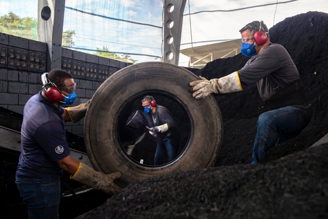En Cariacica, una región metropolitana de Vitória, Espírito Santo, Brasil, una empresa que recicla neumáticos de camiones y autobuses evita el vertido ilegal de 300 toneladas al medio ambiente.