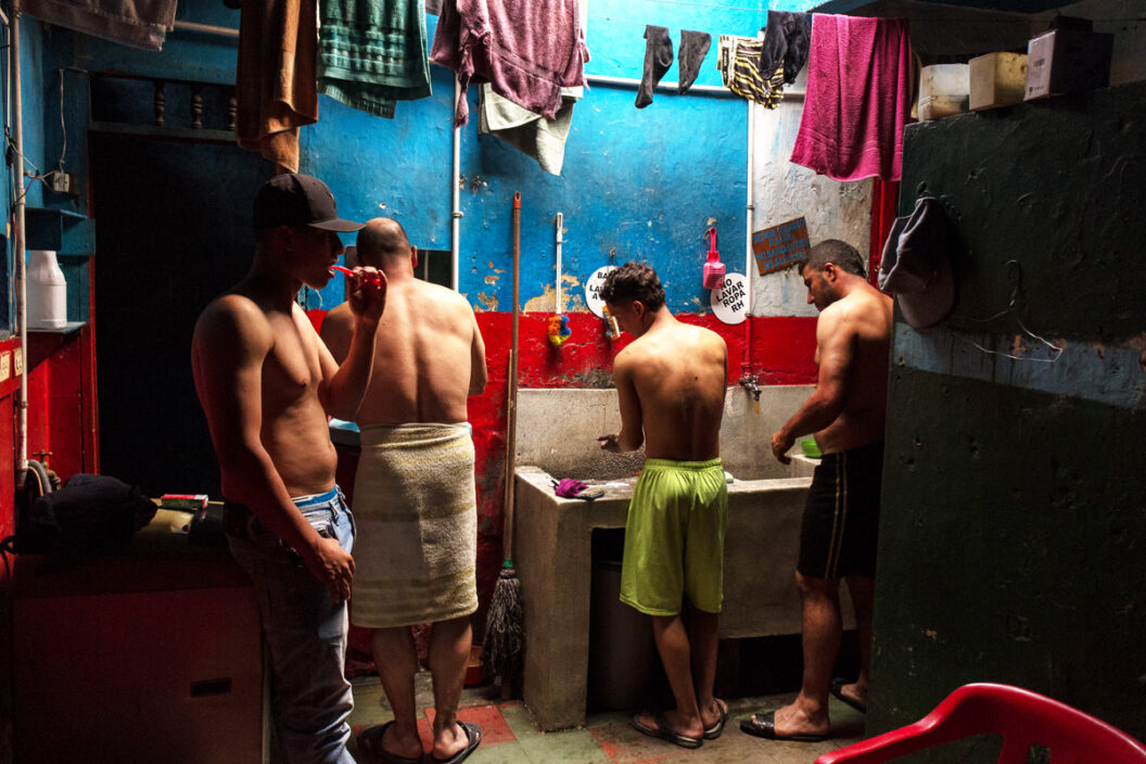 Trabajadores aseándose después de su jornada de trabajo en las calles de Barrio Triste, un sector de mecánicos en el Centro de la ciudad de Medellín, Colombia.