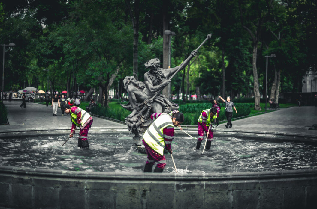 El personal de limpieza de Ciudad de México hace un gran trabajo para mantener limpios y decentes los monumentos del Centro Histórico de la ciudad. En esta imagen capturé el trabajo en equipo de 3 personas aseando la fuente del Dios Mitológico Neptuno en la Ciudadela del Centro Histórico.
