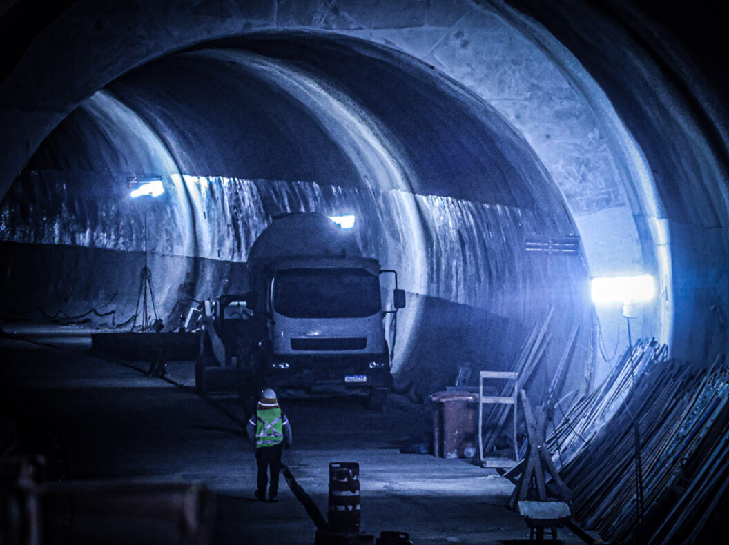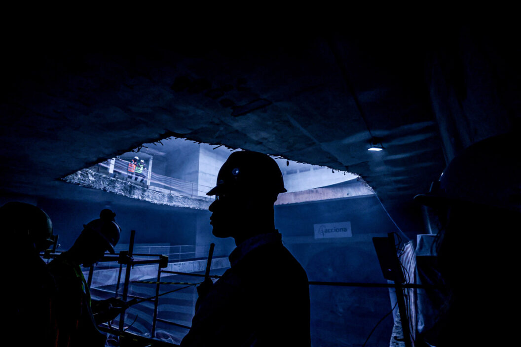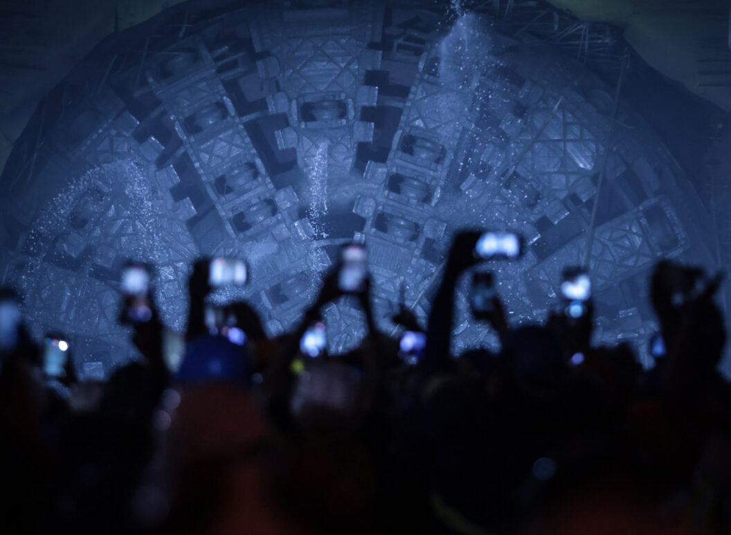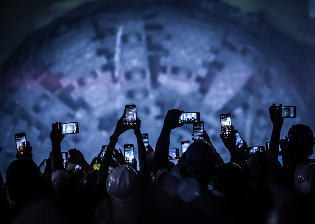 Hombres que trabajaron en el túnel del metro acompañan la llegada del “tatuzão” de la línea 6 – naranja a la futura estación Brasilândia, finalizando las excavaciones del tramo norte del túnel de la nueva línea amarilla del metro de la capital paulista.