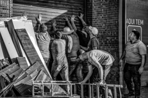 Un grupo de hombres se une para levantar la pesada puerta de hierro, entre escombros y restos de un espacio marcado por la lucha. Las manos extendidas, en sincronía, revelan el esfuerzo colectivo que va más allá de la fuerza física: es solidaridad, es reconstrucción. Cada cuerpo inclinado traduce la urgencia del momento, mientras las miradas se cruzan en busca de coordinación. El contraste en blanco y negro intensifica la dureza de la escena, transformando el trabajo en símbolo de resistencia. Allí, la unión se vuelve necesaria, demostrando que, frente al peso de la vida, nadie se levanta solo.