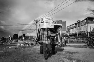 La imagen, en blanco y negro, centra la atención en la dura realidad del hombre. Al ocultar el rostro, la fotografía universaliza su dolor, transformando su carreta de trabajo en un altar móvil de memoria y protesta. Es un grito silencioso y digno que se niega a que la tragedia se pierda en el olvido, un recordatorio de que la búsqueda de justicia en este país puede ser la carga más pesada que se puede llevar.