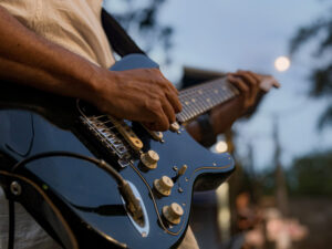 En medio del ruido cotidiano de la ciudad, donde los pasos se confunden con las voces y el movimiento parece no detenerse, aparece él: un hombre con una guitarra eléctrica que convierte el espacio público en escenario. Sus manos, curtidas por años de práctica, recorren las cuerdas con la naturalidad de quien ya no toca un instrumento, sino que se funde con él.
