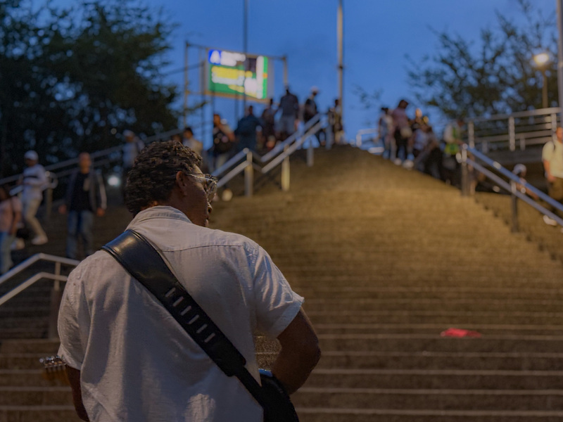 No tiene reflectores ni grandes públicos que lo aplaudan; tiene una escalera, transeúntes apurados y la complicidad de quienes se detienen un instante a escucharlo. Su música es resistencia silenciosa: una forma de recordarle a la ciudad que aún en lo más rutinario late el arte.
