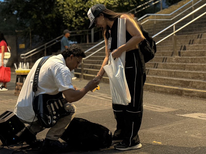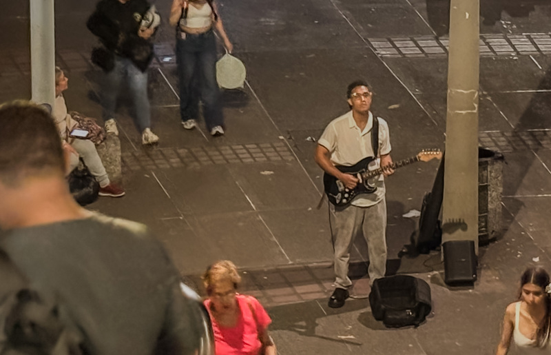 Él no necesita escenario para ser músico; cada nota que nace de su guitarra convierte el cemento en partitura y las luces urbanas en acompañamiento. Su historia no está escrita en discos ni en contratos, sino en los ojos de quienes, por un momento, encuentran en su melodía un respiro del mundo.