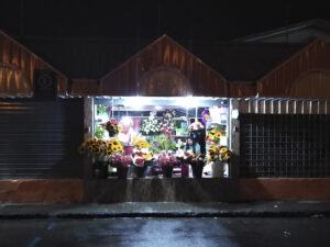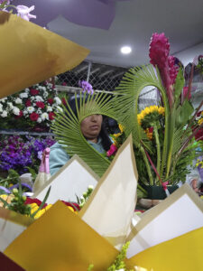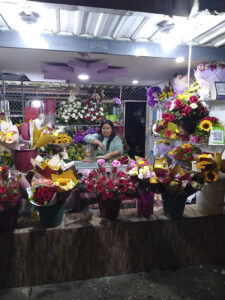 La noche anterior al día de la madre (segundo domingo de mayo), el trabajo no cesa. Cerca de la medianoche María Sánchez continúa elaborando ramos de flores para la venta del siguiente día.