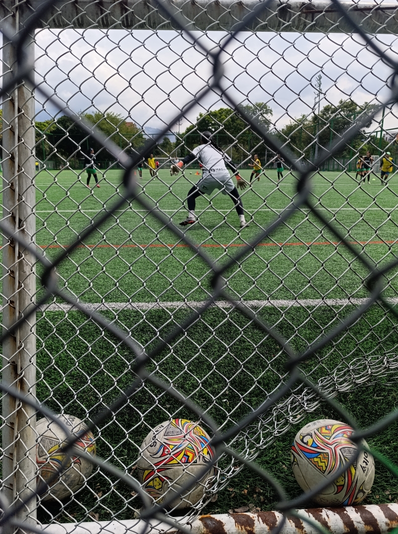 Un día viernes en una unidad deportiva de Medellín, durante el entrenamiento de un equipo femenino de fútbol, la arquera vista en este encuadre de malla tras malla, nos demuestra que esta labor es de control, tal como lo evidencié mientras estuve allí.