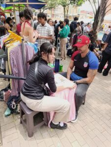 Mientras visité una feria de San Alejo en Medellín un día sábado, entre la inagotable cuota de imágenes, me cautivó esta joven leyendo las cartas a otro hombre joven, en un puesto sencillamente montado justo al lado de la venta de ropa que también la vi atendiendo cuando no tenía a quien “echarle la suerte”.