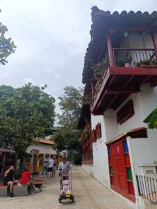 Mientras realiza sus labores de entrega, el trabajador se camufla con el entorno de este sitio turístico en Medellín, bastante concurrido un viernes en la mañana, al tiempo que revisa su móvil.