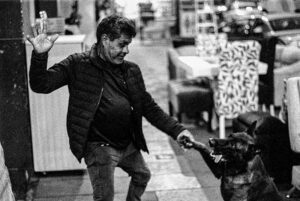 La fotografía muestra un momento cotidiano frente a una mueblería cercana al metro Garibaldi, un negocio que se mantiene abierto hasta la noche bajo la atención de su dueño. En la escena no me centro únicamente en los muebles que ocupan la banqueta, sino en la complicidad entre el hombre y su perro, que transforma el espacio de trabajo en un lugar vivo y cercano. El gesto del comerciante, en aparente juego con su compañero, busco la humanidad y calidez a un entorno urbano que suele percibirse como dificil ademas de la platica con el me permitió documentar de manera más Íntima su relación entre, perro, dueño y oficio.