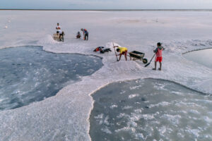 La zona desértica de Manaure, en La Guajira, ha sido por siglos la principal fuente de sal de Colombia. Los salineros wayúu bombean agua de mar hacia piscinas, donde se deja evaporar por acción del sol y el viento. Una vez cristalizada, la sal se raspa manualmente y lava para eliminar impurezas y se apila en montículos. En su mejor época, la producción superaba las 550.000 toneladas anuales; sin embargo, malas gestiones y decisiones administrativas redujeron drásticamente la actividad. Hoy, las salinas siguen siendo parte de la identidad wayúu, aunque marcadas por pobreza y falta de oportunidades.