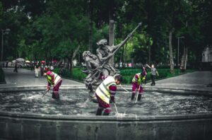 El personal de limpieza de la ciudad de méxico hace un gran trabajo para mantener limpios y decentes los monumentos del Centro Histórico de la Ciudad, en esta imagen capture el trabajo en equipo de 3 personas con la ayuda del Dios Mitológico Neptuno en su fuente, situada en la Ciudadela del Centro Histórico.