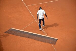 Trabajador Emigrante de procedencia Africana, que se encuentra realizando la limpieza de una de las canchas de tenis, en un prestigioso torneo internacional deportivo. Labor temporal con baja remuneración, aunque muy necesaria e indispensable. Barcelona. España. Abril 2025.