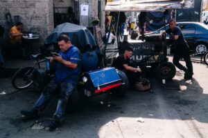 Esta fotografía retrata a los mecánicos en Medellín del Barrio Sagrado Corazón de Jesus, mejor conocido como Barrio Triste. En medio del ruido de motores, la grasa y el color, se revela la dignidad del trabajo manual y la cotidianidad de un barrio que, pese a su nombre, está lleno de vida y movimiento.”