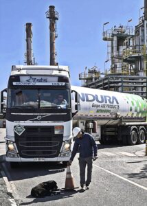 Camionero esperando que salga de camino un anciano perro de la refinería de petróleos ENAP en Hualpen – Chile