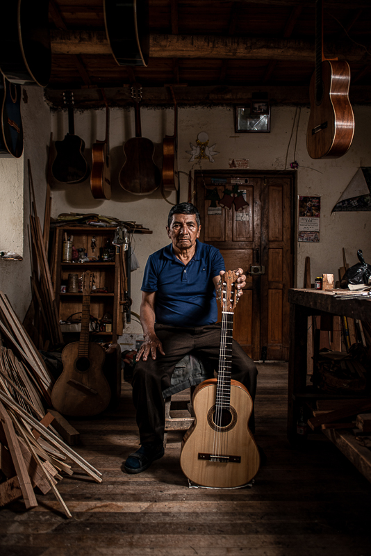 Retrato de Don Emilino Uyaguari en su taller en San Bartolomé, Azuay, Ecuador. Heredero de una tradición centenaria de luthiers, construye guitarras de forma artesanal, combinando técnicas ancestrales con saberes contemporáneos. La imagen resalta la dignidad del trabajo manual y el papel del artesano como transmisor de cultura y memoria.