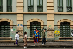 La frase de Gunn reconfigura el mito heroico desde una mirada contemporánea, más sensible a las complejidades del desplazamiento y la alteridad. Así, el Superman tercermundista que representa Chiqui Abello no es una burla, sino una revelación: un cuerpo extranjero, sin origen claro ni destino fijo, que encuentra en la perfomance callejera un modo de existencia. Su traje deteriorado, su presencia en los márgenes urbanos y su gesto cotidiano de resistir, devuelven a la figura del superhéroe su sentido original como símbolo del que llega desde afuera, del que busca un lugar, del que sobrevive gracias a su capacidad de adaptarse y narrarse en un mundo que no siempre lo reconoce.