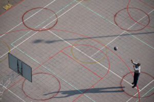 Un cuidador de colegio juega basketball solo en el patio de una escuela vacía durante la cuarentena total por la pandemia de coronavirus, Santiago, Chile, 1 de abril, 2021.