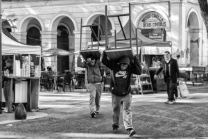 Foto callejera en el transcurso de una feria popular en el barrio de Mataderos, los muchachos debajo de la mesa hacen su trabajo trasladandola para armar los diferentes puestos y dar inicio a la jornada.