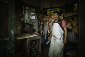 La fotografia tomada en el 2019 en la estancia La Loma Negra, partido de Las Flores, provincia de Buenos aires, retrata al carnicero en plena faena dentro de la carniceria. Entre paredes de azulejos blanco y colgantes de carne fresca, el hombre posa con cuchillo y chaira en mano, vestido con su delantal de trabajo. La escena combina oficio, tradición y ruralidad, evocando un oficio que conserva sus formas en un entorno que habla de historia y esfuerzo cotidiano. La imagen se convierte en testiminio de una identidad ligada al campo y a la cultura del trabajo argentino.