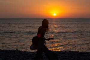 Uma jovem vendedora oferece e vende seus doces sob o Pôr do Sol na orla do Pacífico, na cidade de Lima, no Peru, em janeiro de 2025.