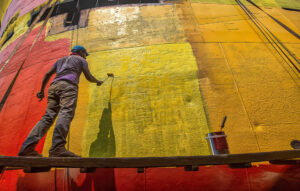 A man painting a ship in a shipyard is undertaking a crucial task for a vessel’s maintenance and longevity.
