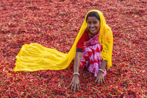 Young Indian woman sorting red chilli peppers.