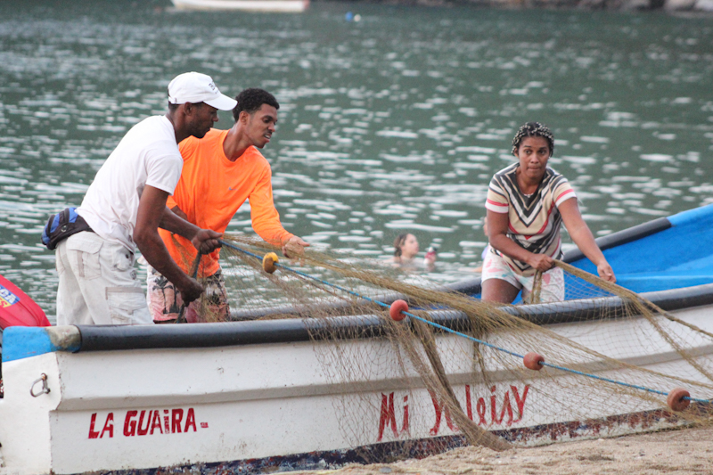En grupo familiar comienzan su jornada de trabajo los pescadores. A un mismo ritmo jalan la red, ese tejido que les permitirá recolectar los peces una vez que eleven anclas.